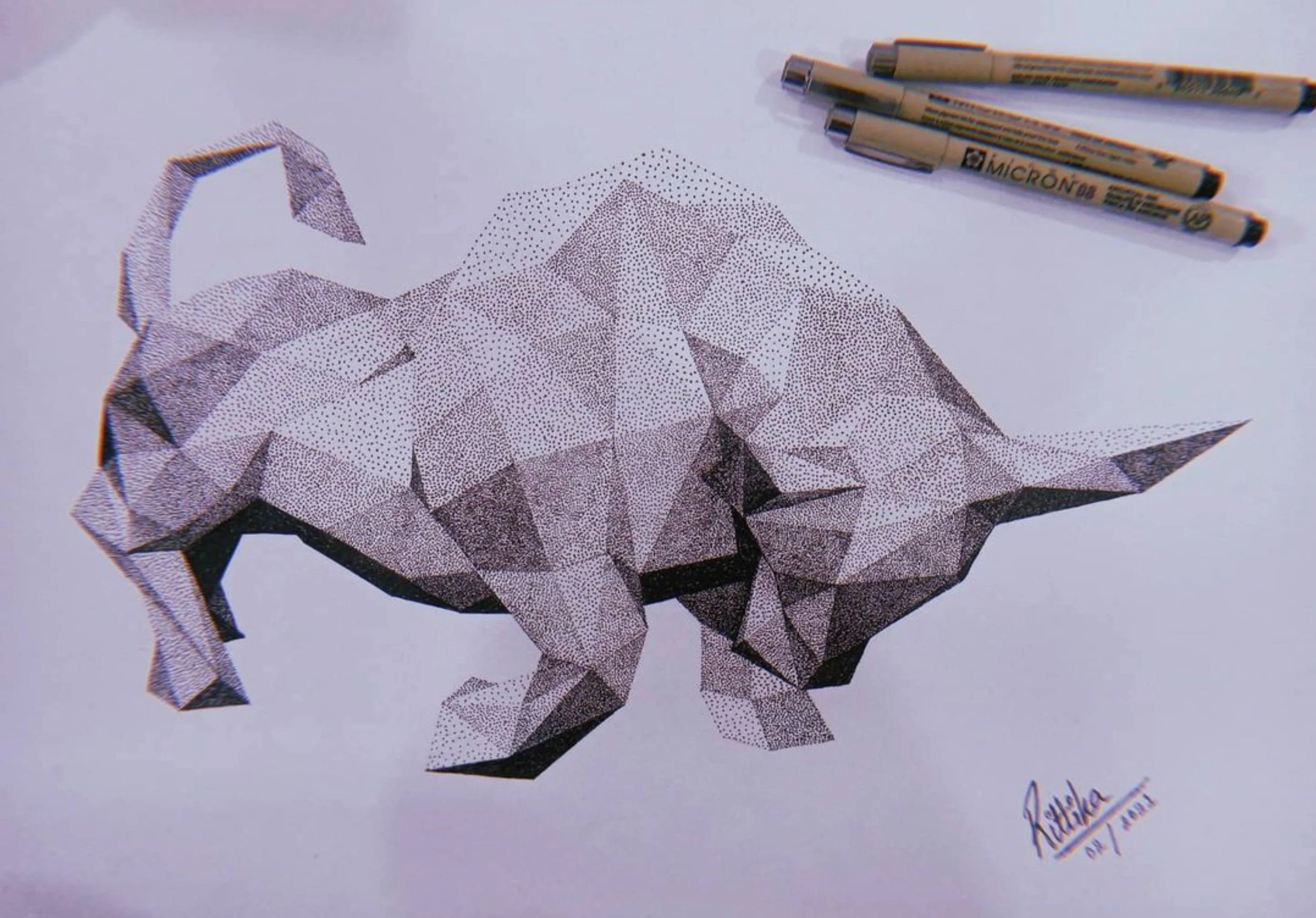 The art or process of drawing, painting, or engraving using numerous small dots or specks.