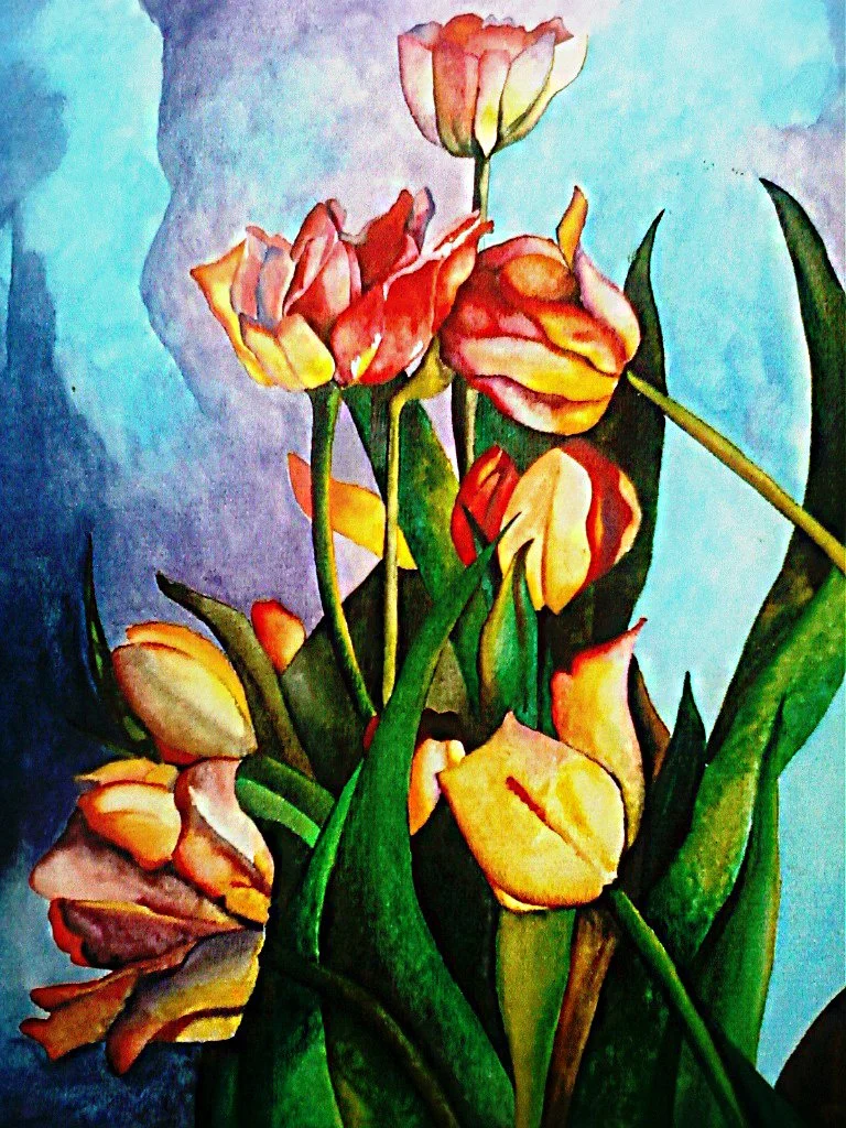 Art made with watercolours which is a type of artists' paint made with a water-soluble binder such as gum arabic, and thinned with water rather than oil, giving a transparent colour.